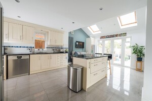 L-shaped Kitchen/Family Room. Fabulous social space with part vaulted ceiling extending to 3.1m headheight. Refitted with a range of shaker style cream units with granite worksurfaces over. Central island unit with units beneath and seating space plus inset induction hob (not tested). Integrated coffee machine (not tested). Integrated microwave (not tested). Integrated ovens (not tested). Space for fridge freezer. Space and plumbing for dishwasher. Stainlesss steel sink unit with drainer and mixer tap over. Cupboard housing Worcester gas fired boiler (not tested). Two vertical radiators. Additional radiator. Drinks fridge (not tested). Tiled flooring. Dining/seating space. Velux rooflights. Two pairs of French doors opening to the paved sun terrace.