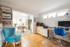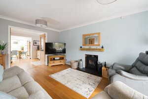 Plus square bay window to front. Woodburner (not tested). Oak flooring. Vertical radiator. Coved ceiling. Double doors to Study.