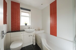 Refitted with a white suite comprising bath with preset thermostat button (not tested), vanity washbasin and low level W.C. Tiled floor. Tiled walls. Heated towel radiator. Window to rear.