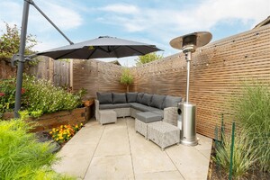 Full width paved sun terrace to the rear of the house leading to lawn with raised borders featuring flowers and shrubs. Further sun terrace with raised contemporary screening lighting.