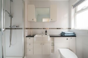 Refitted with a white suite comprising shower enclosure, vanity washbasin and low level W.C. Heated towel radiator. Tiled floor. Tiled walls. Extractor fan. Window to side.
