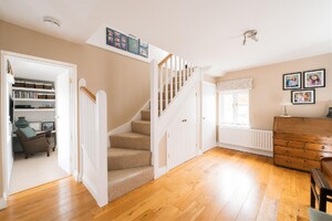 Double glazed window with views over the rear garden. Radiator. Solid oak flooring. Turning staircase providing access to the first floor with oak handrails. Built-in understairs storage cupboard plus an additional built-in cloaks cupboard with hanging rail for coats. Telephone point. High moulded skirting boards. Panelled doors providing access to the Kitchen and Sitting Room. Exposed beams. Door providing access to:-