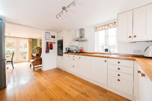 A dual aspect Kitchen with double glazed windows to the side and front. The Kitchen is fitted with a matching range of classic shaker style cream fronted storage units with soft close doors and drawers. Solid oak worksurfaces with matching oak upstands. Single drainer stainless steel sink unit. Four ring gas hob with extractor over (not tested). Fitted double eye level oven (not tested). Integrated dishwasher (not tested). Matching fitted wine rack. Partly ceramic tiled splashback to the hob. Solid oak flooring. Vertical radiator. High moulded skirting boards. Space for an upright fridge freezer. Under unit lighting. Door to Utility. Open plan access to the Dining Room.