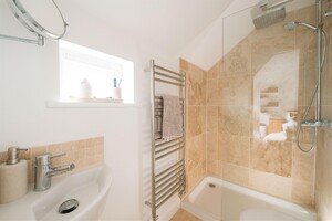 Fitted with a white contemporary style suite featuring a concealed cistern push button low level W.C, corner wall mounted washbasin and shower cubicle with screen door with fixed and flexible shower heads. Travertine tiling to splash areas and floor. Heated towel rail. Moulded skirting boards. Wall light. Extractor fan. Recessed spotlighting. Double glazed window to the front.
