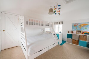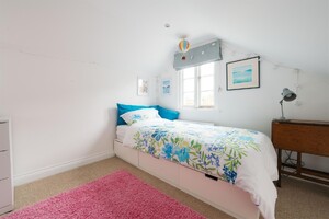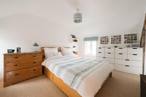 A dual aspect room with double glazed windows with views over the front and rear gardens. Access to the loft space. Built-in wardrobe cupboard with hanging rail and top storage locker. Exposed wall beam. Feature exposed brickwork to the chimneybreast. Radiator. Television point. Telephone Point. Additional built-in wardrobe cupboard with hanging rail over the stairs.