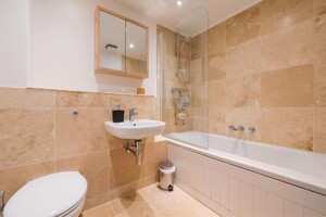 Fitted with a modern contemporary style suite featuring a concealed cistern push button low level W.C, wall mounted washbasin with chrome mixer taps and panelled bath with central wall mounted chrome taps and fitted shower pllus shower screen. Recessed spotlighting. Extractor fan. Heated towel rail. Partly travertine tiled walls. Travertine tiled floor.
